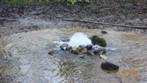 Конечно, эти небольшие фонтанчики, бьющие из земли, настоящими гейзерами не являются. Эта вода из подземных скважин, пробуренных то ли в 1980-е, то ли ранее. Были обнаружены подземные источники воды и их хотели использовать для водоснабжения Гатчины и даже Петербурга. Но вода оказалась слишком минерализованной, а её запасы не слишком большими. Скважины закупорили, но вода пробилась в шести местах. Самые живописные и посещаемые — гейзеры Пень, Малыш и Фонтан. Особенно запомнился Пень — это труба, плотно обросшая мхом. Кажется, что это правда пень, из середины которого бьёт родник. Фонтан тоже впечатляет — он сразу впадает в Парицу. Малыш тоже радует глаз. Вода холодная, приятная на вкус. При посещении гейзеров заодно смотрим и красивую лесную природу.