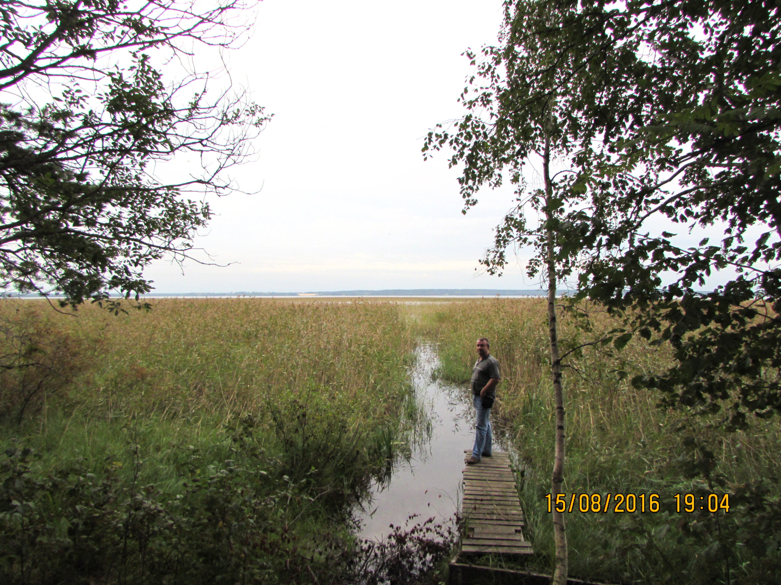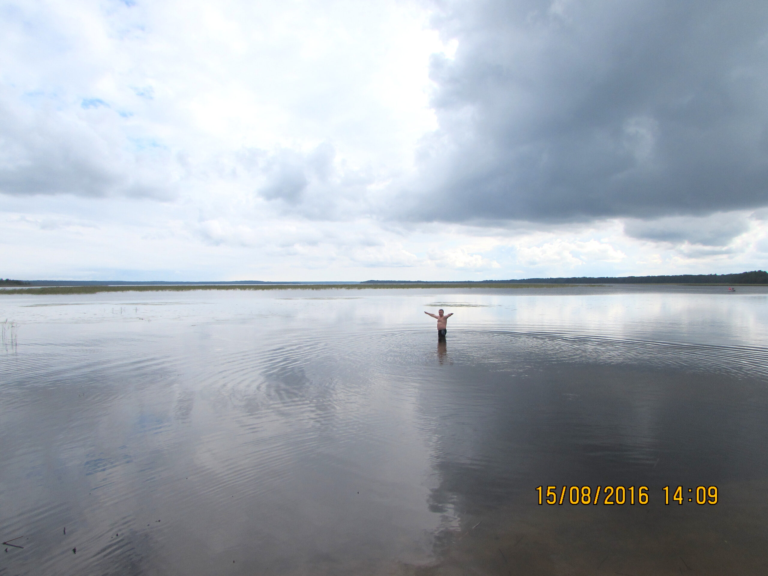 Берега озера песчано-каменистые, покрыты хвойным или смешанным лесом. Есть очень красивые участки с песчаным дном и удобным заходом в воду. Часть берегов заросли камышом или тростником, там до воды не добраться. Тем, кто не знаком с озером, приходится приложить усилия для поиска подходящего места. Наши поиски были не очень удачными, мы застряли посередине поля. Не надо ездить по полям после дождей. Вырвавшись из колеи с помощью отзывчивого водителя Лексуса, со второй попытки мы нашли хорошее место у поселка Солнечное. Там и купание вышло отличное, и пейзажи неплохие. На озере есть и другие хорошие места, с учётом находящихся там баз отдыха.