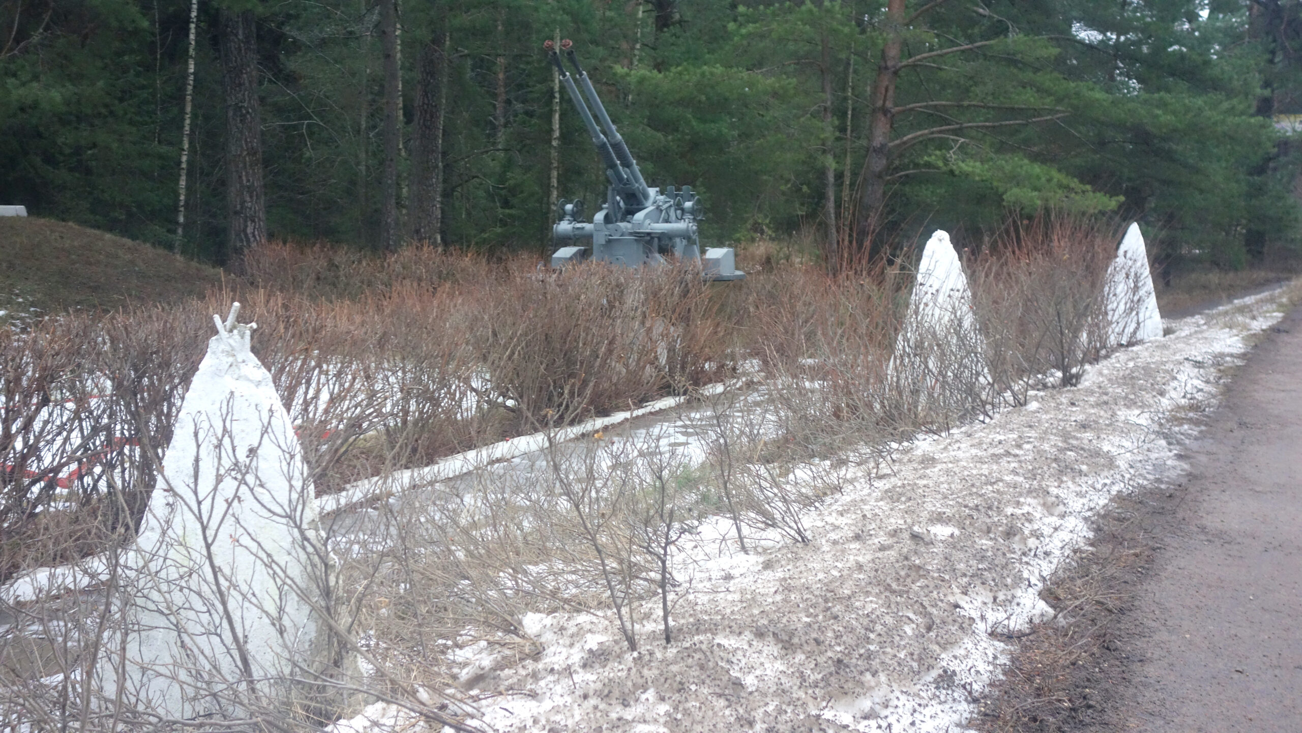 К мемориалу ведёт лестница. Около неё установлены зенитное орудие и якорь.