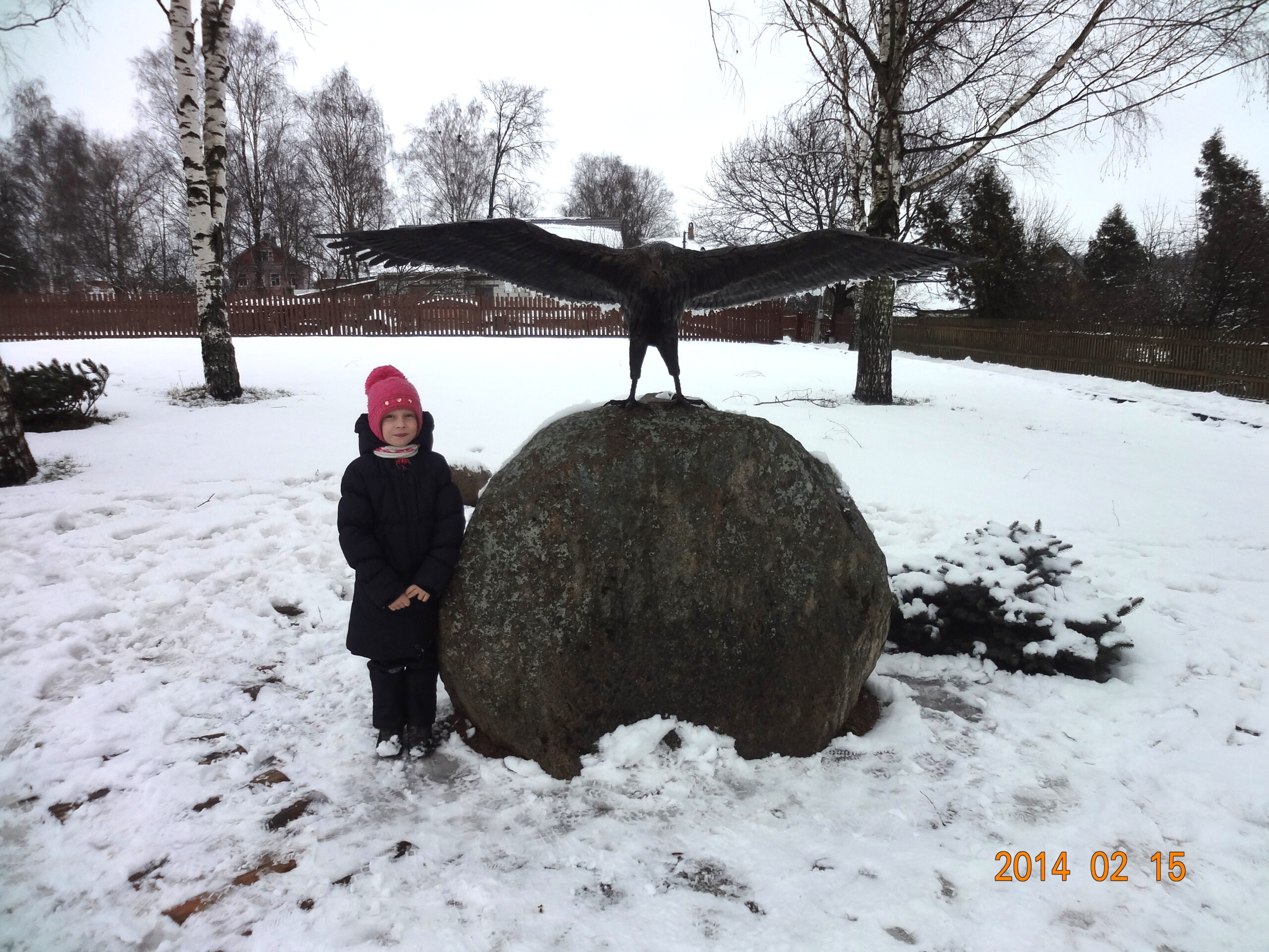 Сокол с распахнутыми крыльями является символом рода Рюриковичей. Бронзовый сокол, сидящий на камне, будто готовится взлететь. Автором скульптура является скульптор Шоор. Установлена в 2013 году. В 2021-м была украдена, через год установили точную копию.