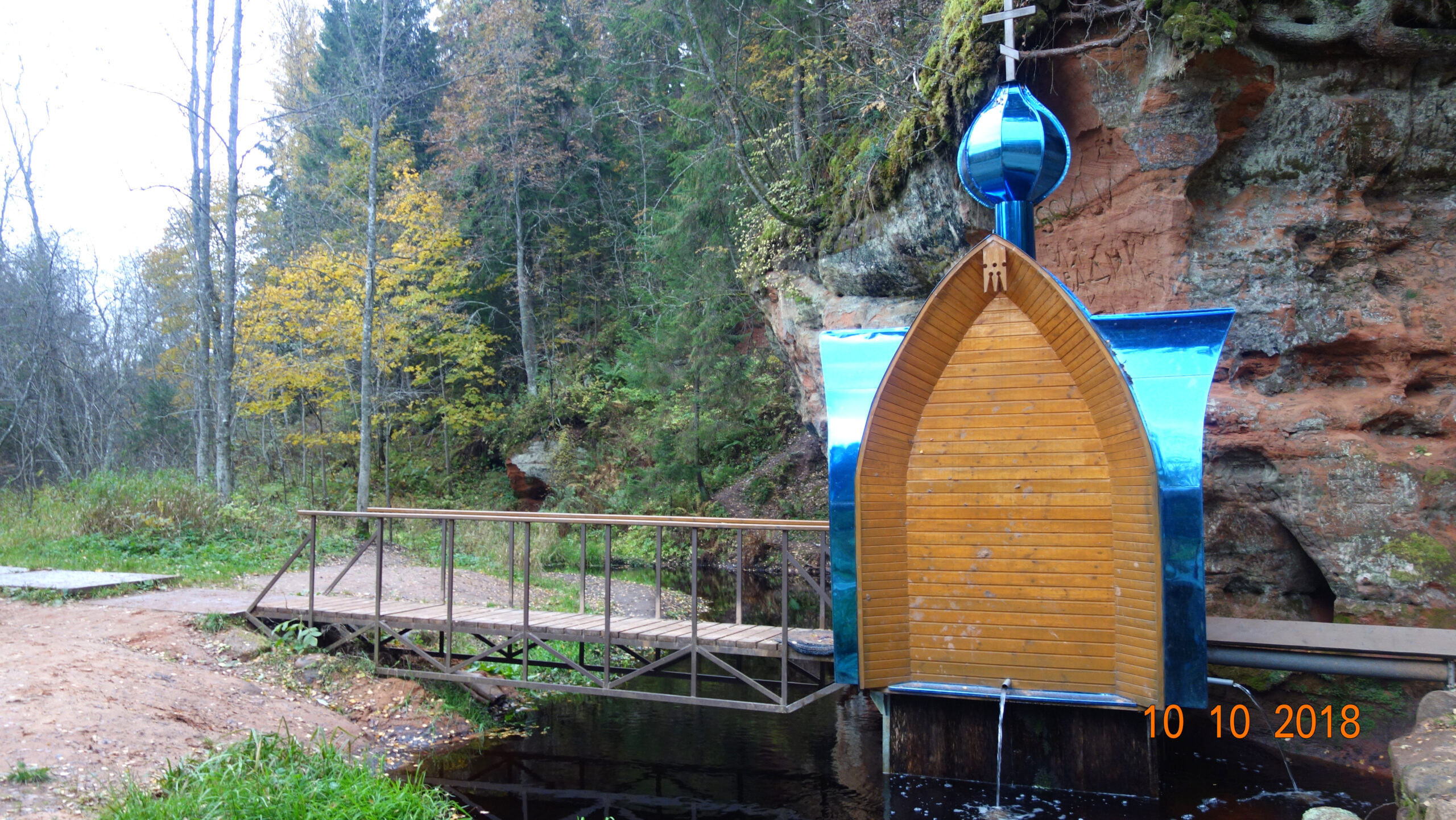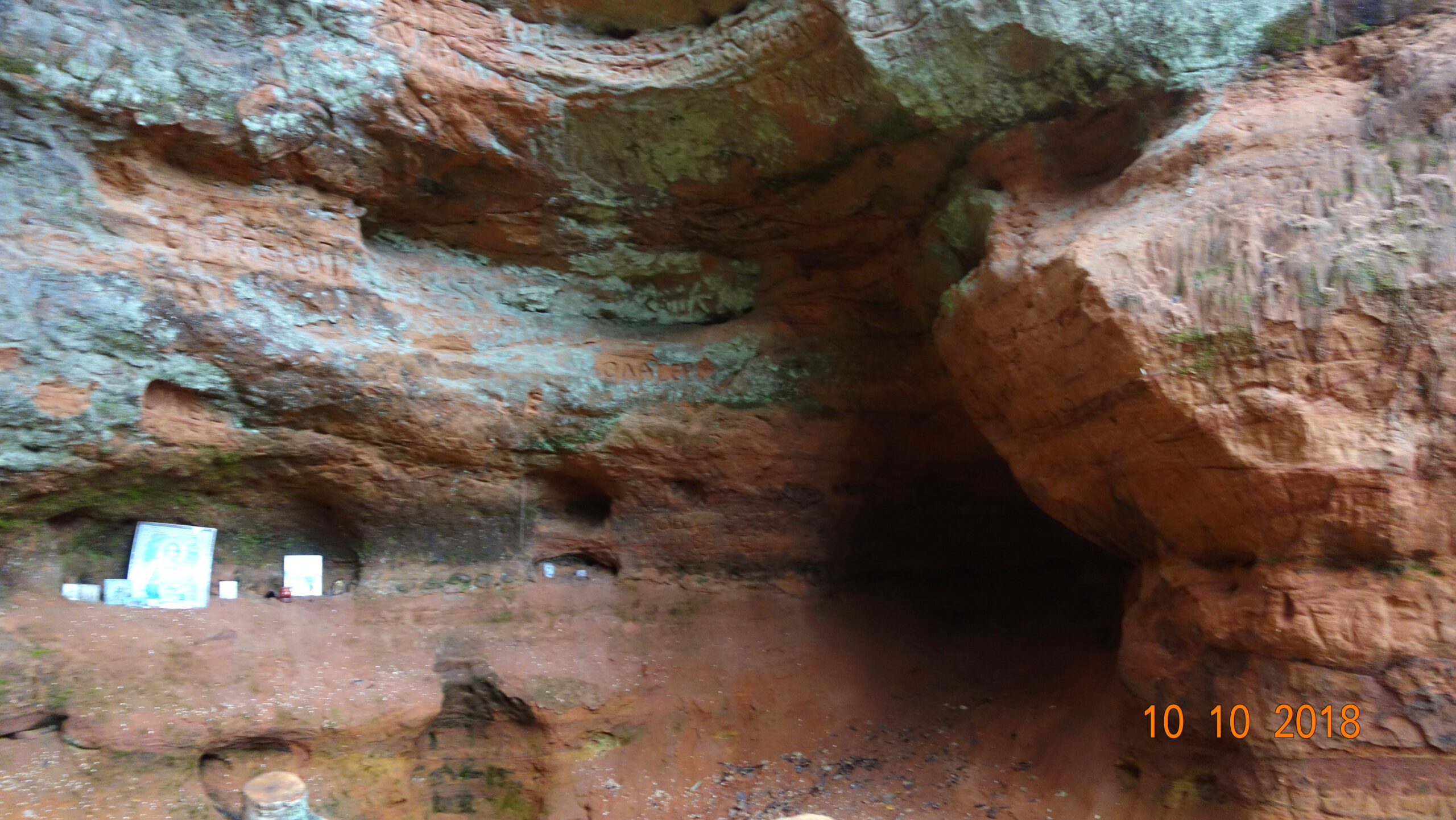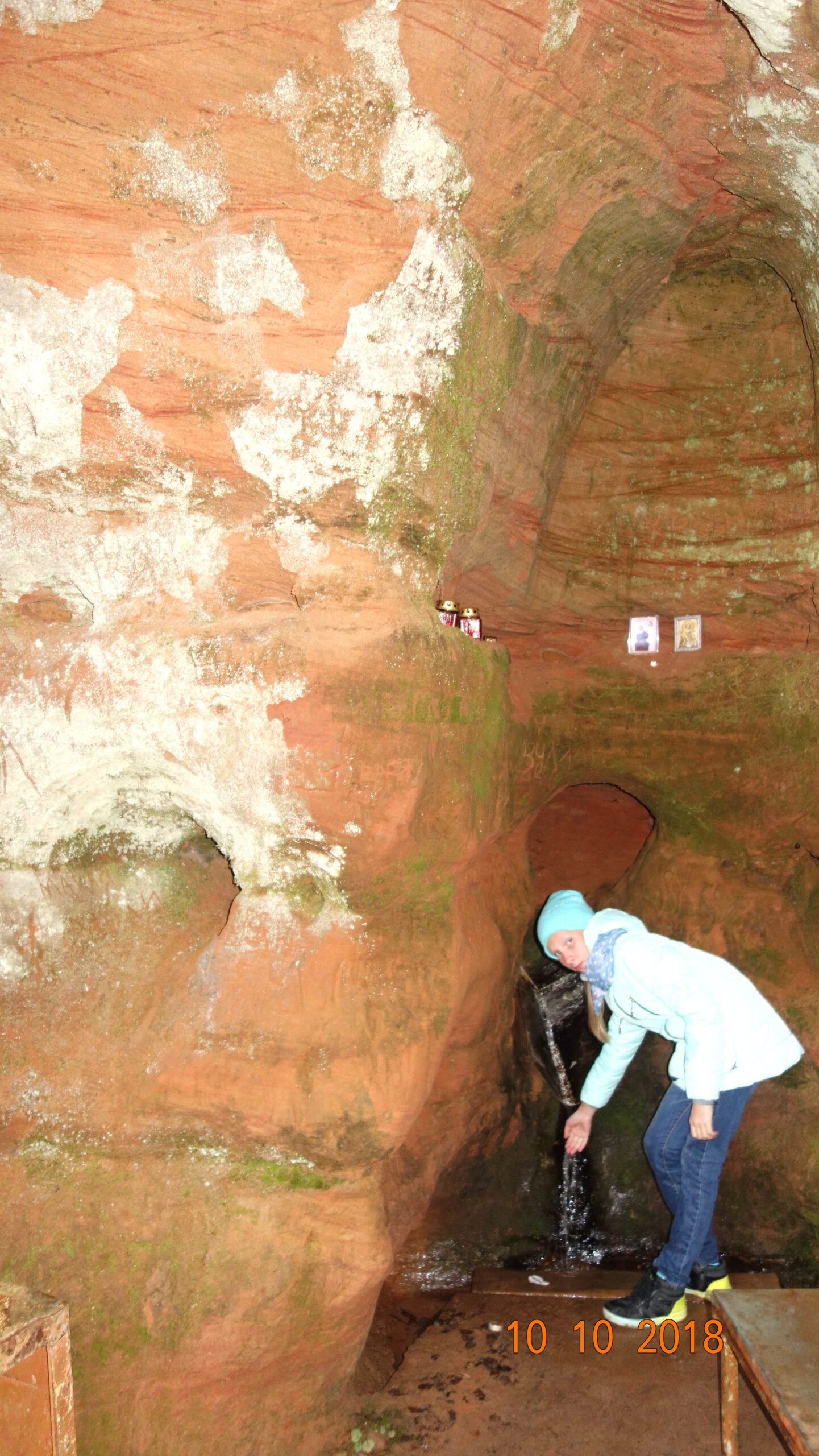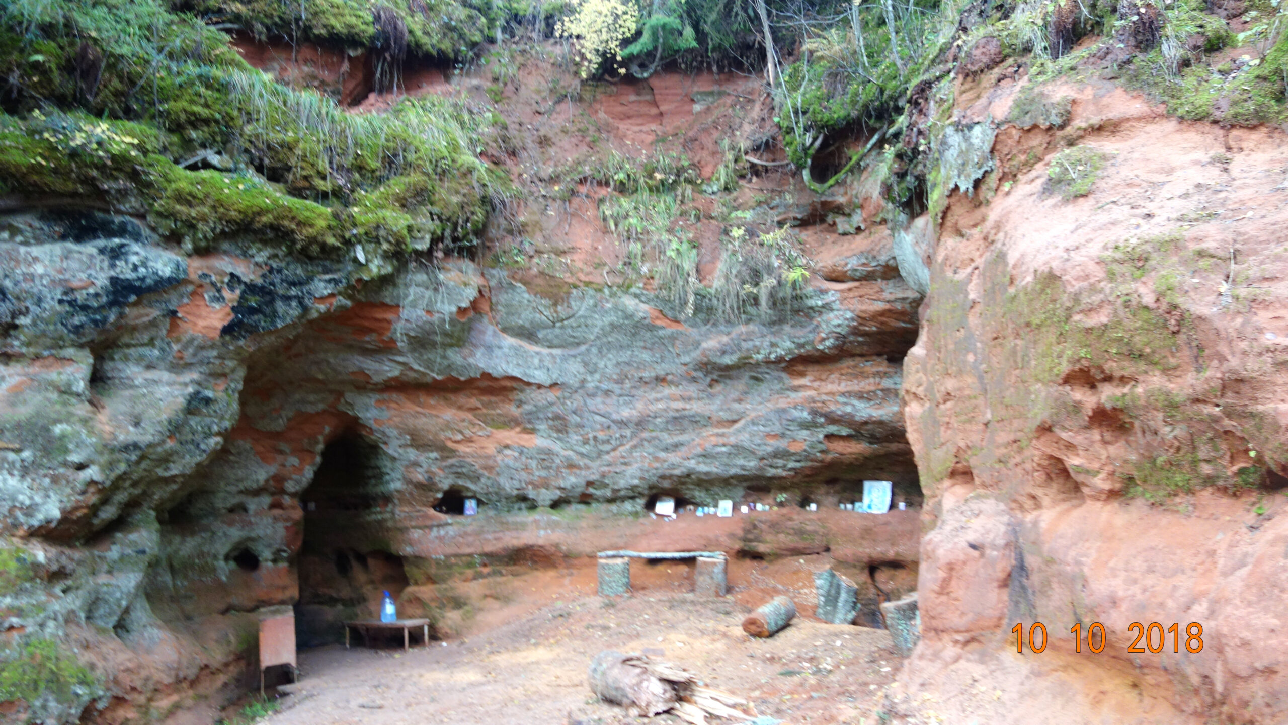 Очень красивое и необычное место. Особенно впечатляет разноцветная стена карстовой пещеры — вся в неровностях. И цвета бурые, красные, зеленоватые. Она еще покрыта мхами и видна корневая система растущих сверху деревьев.